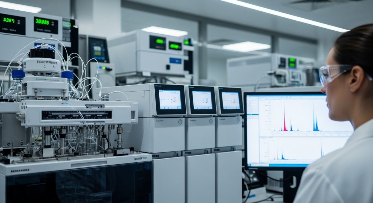 Once the dried extract is ready, analytical testing confirms whether the batch meets specification. High-performance liquid chromatography (HPLC) is the industry standard. It separates compounds through a stationary phase interaction and converts the area-under-curve data from each peak into percentage concentrations.